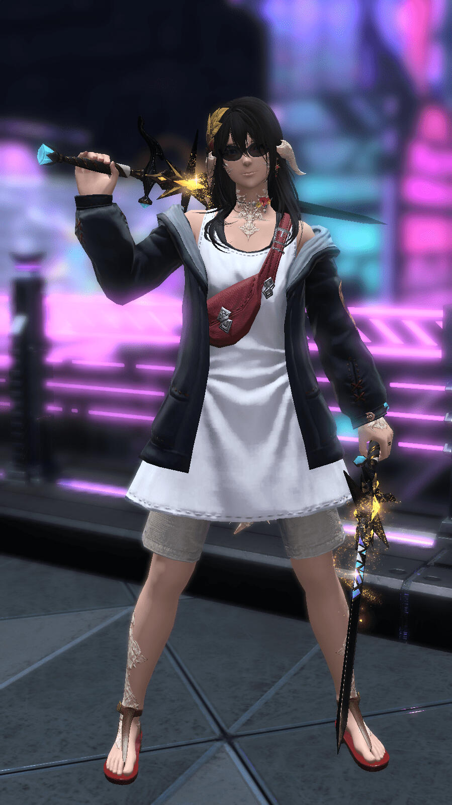 hair style: primarily short and messy (I always compare it to Ramona Flowers from the Scott Pilgrim comics), post Dawntrail she allows it to grow out down to her shoulders